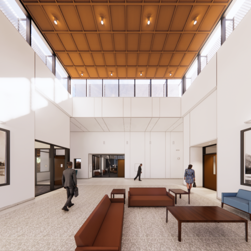Rendering of a first-floor lounge area next to a central staircase. Ascalon Medical Office Building