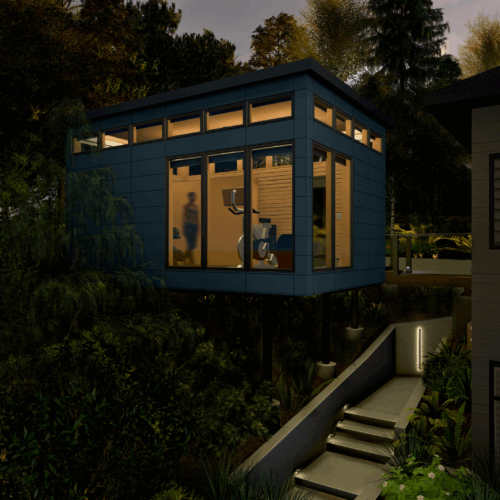 Large sliding doors of a home's separated art studio. Backyard Art Studio